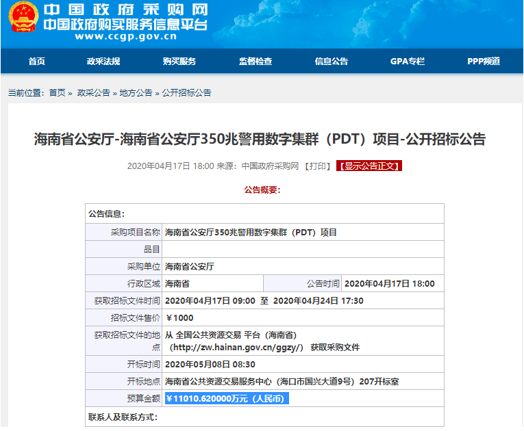 主頁(http://www.130131.com):2020年最后一個公安省級PDT項目,1.1億大單花落誰家?