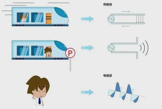 天線的原理 天線把傳輸線上傳播的導(dǎo)行波,變換成在自由空間中傳播的電磁波,或者進行相反的變換。導(dǎo)行波是全部或絕大部分電磁能量被約束在有限橫截面內(nèi)沿確定方向傳輸?shù)碾姶挪ā?/p> 我們用火車旅行進行類比,乘客好比是電磁波,傳輸線好比是火車。 乘客上車后,只能在車內(nèi)活動,乘客隨著火車的前進的方向移動,這就好比是導(dǎo)行波,約束在有限橫截面內(nèi)沿確定方向傳輸。 出站后,乘客可以自由活動,這就好比是電磁波在自由空間傳播。這里火車門就類似于天線。