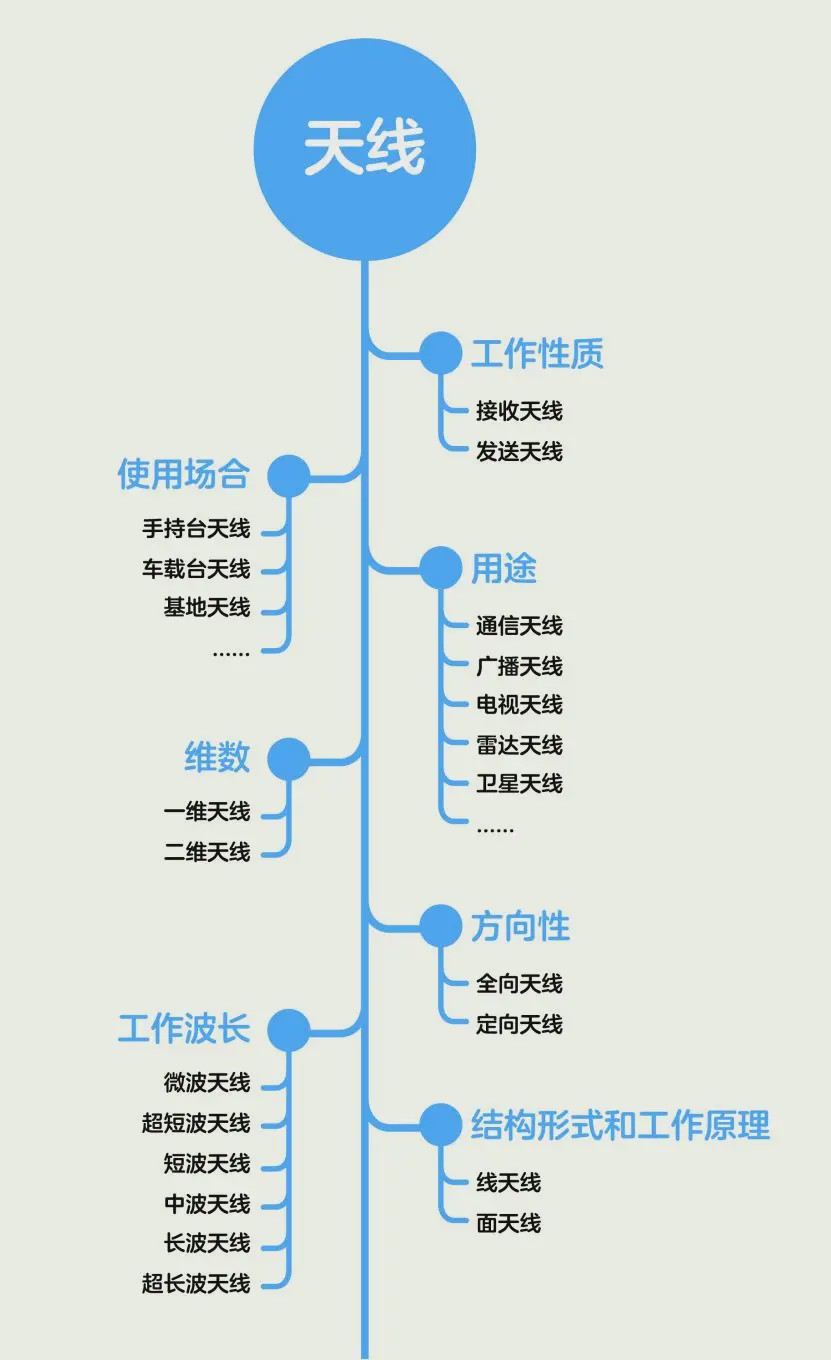 可以看出天線的尺寸與波長相匹配。 波長和頻率之間有著密切關(guān)系,光速=頻率×波長(),從1G到5G,使用的頻率越來越高,波長越小,對應(yīng)天線的尺寸越小,這就是為什么手機的天線可以藏到手機里面了。 由于天線理論比較復(fù)雜,此處就不再詳述,如果感興趣可以自行學(xué)習(xí)。 天線的分類 為了滿足各種各樣的實際需求,工程師發(fā)明了各種各樣的天線,前文提到的形態(tài)各異的設(shè)備,真的都是天線,下面給出天線的一個大致分類圖。