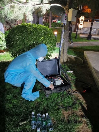 4小時的“競速戰(zhàn)役” 按照規(guī)定,小組三位成員必須在當(dāng)晚8時結(jié)束戰(zhàn)斗,只有4個小時!一切都是未知數(shù),疫情形勢下現(xiàn)場情況需要詳細(xì)摸排,落實落細(xì)每一個技術(shù)細(xì)節(jié)。面對緊急情況,小組成員以最快速度溝通決定,對現(xiàn)場部署進行精細(xì)量身定制:取件、配置、測試、網(wǎng)優(yōu)、布控設(shè)備調(diào)試、現(xiàn)場培訓(xùn),全流程環(huán)節(jié)一個不能少,時間再緊,活也必須干得漂亮!防控必須到位! 穿著防護服的“部署操作” 此次任務(wù)地點的月壇街道是北京疫情中風(fēng)險地區(qū),同時又是核酸檢測點,安全起見,小組成員必須穿起防護服進行施工。沒有醫(yī)護人員的操作經(jīng)驗,成員們只得“束手束腳”嘗試,要做設(shè)備搭建的“大動作”,還要做精細(xì)調(diào)試的精微“小動作”,防護服包裹在身上,以往的駕輕就熟這會兒竟有些“笨拙”。三十多度的高溫天氣,防護服里的身體完全被汗水浸濕,順著后背直往下流。任務(wù)不等人,不能停歇,一次,兩次,三次,反復(fù)嘗試,小組成員們?nèi)σ愿,直到完全調(diào)準(zhǔn)、萬無一失。 俯身草坪的“精裝調(diào)試” 簡單的草坪,沒有桌椅陳設(shè),戶外現(xiàn)場實施難度異常高。三位調(diào)試“尖兵”精準(zhǔn)協(xié)同,或弓著身子,或伏在草坪,高難度完成設(shè)備配置、電纜連接、精細(xì)調(diào)試,前后臺通力配合終達“任務(wù)使命”,僅僅4小時即“火線沖刺”,迅速完成測試現(xiàn)場寬帶集群調(diào)度臺、寬帶集群終端部署。