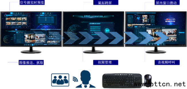 無縫切換、開窗、縮放、跨屏、漫游、疊加顯示等拼接大屏應(yīng)用。 自定義畫面布局、顯示模式、輪巡、輪切。 實時信號源預(yù)覽回顯,全可視化調(diào)度 自定義預(yù)案,一鍵切換,定時切換 云端管理,大屏分區(qū)域管理,多用戶分權(quán)限同步操作 智能控制管理環(huán)境及設(shè)備狀態(tài) 通過平臺管理軟件對系統(tǒng)內(nèi)信號源進行實時預(yù)監(jiān),對大屏顯示畫面進行實時預(yù)覽。畫面清晰流暢,無卡頓。 支持視頻底圖、圖片底圖,單屏或多屏拼接顯示 支持跑馬燈動態(tài)流動顯示,跑馬燈文字自定義 02 KVM坐席協(xié)作 KVM功能可輕松實現(xiàn)一人控制多臺計算機的應(yīng)用: