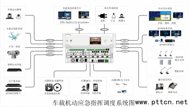 可視化坐席管理軟件,支持預(yù)案、預(yù)覽、布局、圖像跟隨/推送/抓取、音量調(diào)節(jié)、終端呼叫、系統(tǒng)設(shè)置等功能。 信號源管理:支持可視化實時預(yù)覽、列表管理、收藏管理,操作權(quán)限管理等。支持對用戶,座席、大屏、窗口等信號的推送與抓取。 單顯示器多畫面顯示:在單個顯示器內(nèi)可4分頻顯示4路信號,鼠標可在4分屏內(nèi)跨屏進行操作,可將任意一個分屏進行全屏顯示。 鼠標顯示器間滑屏操作:通過一個鼠標可在多個顯示器之間進行任意滑屏操作。 鼠標位置提醒:鼠標滑到當前位置,當前窗口會顯示藍色邊框進行提示。 大屏控制管理:操作人員通過KVM操作界面即可對權(quán)限內(nèi)的大屏幕進行直接控制,包括信號推送、開窗漫游、移動、清空、場景設(shè)置等。 系統(tǒng)自帶HDMI和USB接口,可接入鼠標鍵盤顯示器,方便對機動指揮所內(nèi)受控主機進行選擇,并進行遠程控制,真實還原受控主機桌面情況。 03 混合視頻處理 雙引擎交互背板:支持本地視頻線輸入SDI/HDMI/DVI/MPO光纖輸入等,所有視頻輸入采用全編全解+背板矩陣雙引擎背板技術(shù),保障高質(zhì)量的圖像畫質(zhì),滿足低帶寬下的高畫質(zhì)和低延時應(yīng)用,同時解決圖像質(zhì)量和存儲容量問題。 支持遠程網(wǎng)絡(luò)信號、本地POE IPC輸入,支持TS流、RTMP、RTSP等多種流媒體格式,支持GB28181、SIP、ONVIF等接入?yún)f(xié)議,實現(xiàn)第三方IP流媒體信號融通,集中管理可任意調(diào)用。 04 混合音頻處理 32*32的混合音頻器引擎,支持12路模擬音頻輸入,8路模擬音頻輸出;16*16的DANTE的數(shù)字音頻處理;可對接入的音頻進行混音、增益、消噪、回聲抑制等處理,支持音頻信號的快速切換和預(yù)案切換,支持音頻編碼,實現(xiàn)指揮車內(nèi)的音頻集中處理。 05 融合通訊管理 支持IP視訊終端功能;支持PSTN模擬電話、集群對講、調(diào)音臺等設(shè)備的語音接入;可調(diào)度任意音頻輸入作為通訊終端的音頻源;可調(diào)度任意視頻輸入作為通訊終端的視頻源;支持視頻監(jiān)控、視頻會議、智能終端(手機/單兵)等設(shè)備的音視頻接入;支持GB28182、SIP、ONVIF等通訊協(xié)議,這種整合突破了傳統(tǒng)的簡單視頻監(jiān)控模式、視頻會議模式及圖像傳輸模式,實現(xiàn)圖像、數(shù)據(jù)和話音融合調(diào)用傳輸,提供了極為貼合指揮調(diào)度模型的專業(yè)可視指揮調(diào)度應(yīng)用。 06 中控管理 支持8路RS232/RS485可控輸出,通過串口、IP、紅外、繼電器、IO等協(xié)議,實現(xiàn)對各類外設(shè)的集中控制管理,通過可視化管理終端實現(xiàn)音視頻與周圍的環(huán)境統(tǒng)一集成控制,避免繁瑣的多套軟件切換過程。 07 錄播管理 支持10路以上全程錄播,實時記錄音視頻軌跡。提供錄制、直播、點播、回放,支持文件查看、導(dǎo)出、編輯。 08 網(wǎng)絡(luò)與定義管理 提供網(wǎng)絡(luò)三層網(wǎng)絡(luò)交換管理功能,對不同信號作分類分VLAN管理。提供設(shè)備定位功能,內(nèi)置GPS/北斗。 — 系統(tǒng)拓撲 —
