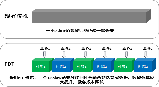 PDT標準采用先進的數字語音壓縮技術,相對于現有的模擬技術,具有語音清晰、頻譜效率高、通信距離遠、抗干擾能力強、安全、省電和支持數據業務等優點,并支持數模兼容,能有效滿足公共安全、市政、消防等專業用戶的無線通信應用需求。 二、PDT數字集群系統優勢①高頻譜效率,提升系統容量 PDT采用TDMA時分多址技術,在12.5kHz載波帶寬上,一幀支持兩個時隙,可以同時支持2路通話,相對于12.5kHz帶寬的模擬系統,容量提升了2倍,相對于25kHz帶寬的模擬系統,容量提升了4倍。