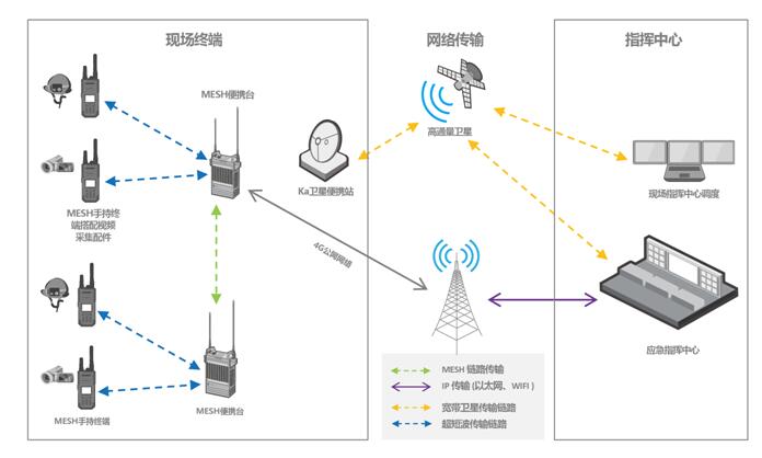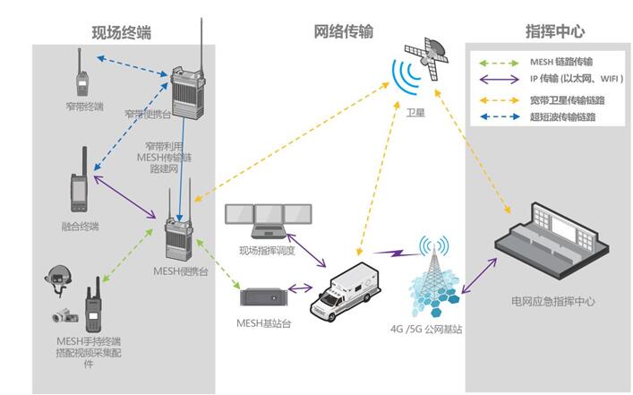 應(yīng)急通信是電網(wǎng)應(yīng)急救災(zāi)工作順利進行的“鋪路石”。在遭遇突發(fā)災(zāi)害和事故時,既可以為指揮調(diào)度提供通信保障,還可以為災(zāi)區(qū)群眾提供語音、視頻、圖像、短信等多元通信業(yè)務(wù)。北峰電網(wǎng)應(yīng)急空天一體化通信系統(tǒng)方案,在救災(zāi)工作中又是如何發(fā)揮作用? 三、設(shè)計方案 北峰電網(wǎng)應(yīng)急空天一體化通信系統(tǒng)方案的設(shè)計理念是:通過MESH自組網(wǎng)設(shè)備、窄帶中繼設(shè)備及傳輸通信設(shè)備的應(yīng)用,實現(xiàn)一個完善的電力應(yīng)急通信系統(tǒng),提供較大的傳輸帶寬和一定的無線覆蓋范圍,滿足廣西電網(wǎng)突發(fā)應(yīng)急和日常巡檢等不同場景下的音視頻和部分?jǐn)?shù)據(jù)業(yè)務(wù)傳輸需求,實現(xiàn)電力搶修的快速、安全。