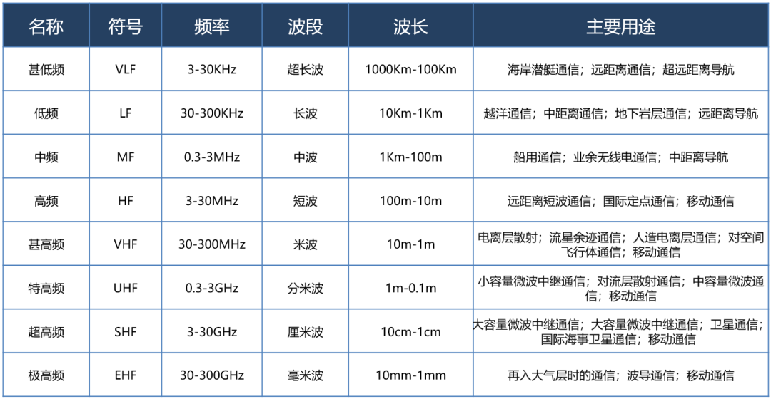 從宏觀來看,主要分為光波和電波我們人類無線通信,目前主要用的是電波。早期用的低頻和中頻電磁波,現(xiàn)在逐漸往高頻甚至太赫茲(就是上圖中間的THz)發(fā)展。也有科學家,在研究可見光通信(往光波發(fā)展)。 無線電磁波的電波這部分,看上去頻率資源挺多的,但實際上,每個頻率,都被政府有關部門規(guī)定了對應的用途。