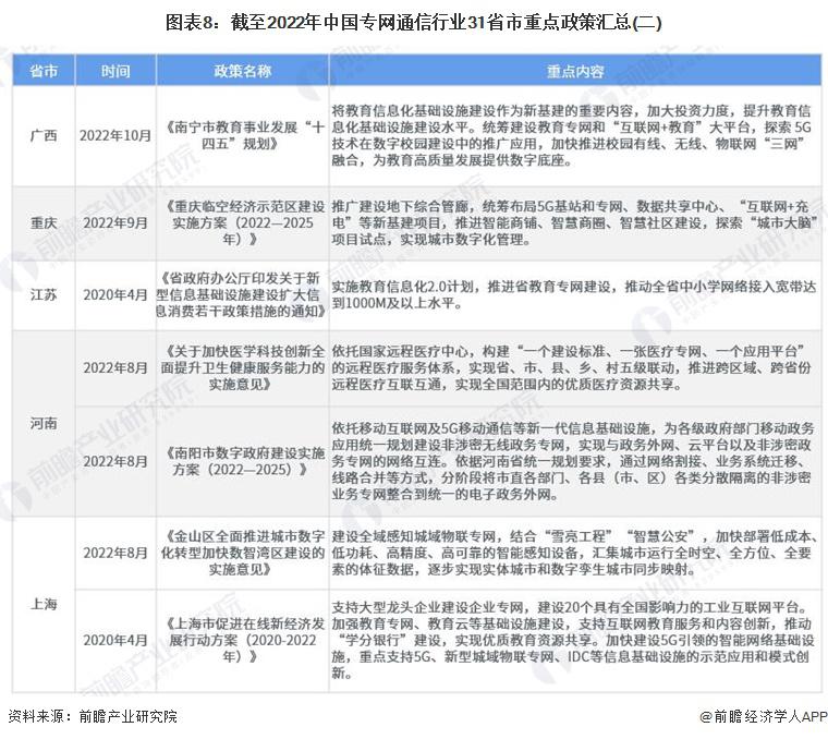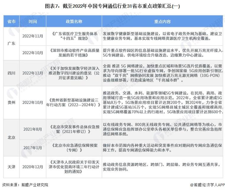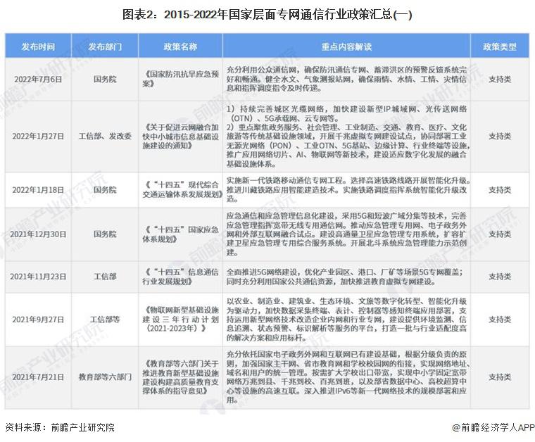 主頁(http://www.130131.com):重磅!2023年中國及31省市專網(wǎng)通信行業(yè)政策匯總及解讀(全)政策 行業(yè)主要上市公司:中國電信 ( 00728 ) 、中國聯(lián)通 ( 600050 ) 、中國移動 ( 00941 ) 、海能達 ( 002583 ) 、海格通信 ( 002465 ) 、烽火電子 ( 000561 ) 等 本文核心數(shù)據(jù):國家層面專網(wǎng)通信行業(yè)政策匯總 ; 地方層面專網(wǎng)通信行業(yè)政策匯總 ; 國家層面專網(wǎng)通信行業(yè)發(fā)展目標解讀 1、政策歷程圖 我國專網(wǎng)通信相關(guān)政策,隨專網(wǎng)通信產(chǎn)業(yè)下游應(yīng)用的發(fā)展而發(fā)展。2018 年以前,專網(wǎng)通信政策主要集中于應(yīng)急通信與公共安全領(lǐng)域。2017 年出臺的《國家突發(fā)事件應(yīng)急體系建設(shè) " 十三五 " 規(guī)劃》強調(diào)加強衛(wèi)星應(yīng)急專網(wǎng)的統(tǒng)籌規(guī)劃,加快城市寬帶數(shù)字集群專網(wǎng)系統(tǒng)建設(shè),提高國家應(yīng)急通信保障能力。《公安科技創(chuàng)新 " 十三五 " 專項規(guī)劃》中強調(diào)研發(fā)新型智能裝備,提高防控打擊綜合能力,并且加強對警務(wù)指揮通信等技術(shù)裝備的研發(fā)。 2018-2019 年,隨著互聯(lián)網(wǎng)教育的興起,教育專網(wǎng)的發(fā)展提上日程。2019 年,發(fā)改委發(fā)布《關(guān)于促進 " 互聯(lián)網(wǎng) + 社會服務(wù) " 發(fā)展的意見》,強調(diào)實施學校聯(lián)網(wǎng)攻堅行動,加快建設(shè)教育專網(wǎng),實現(xiàn)所有學校接入快速穩(wěn)定的互聯(lián)網(wǎng)。根據(jù)《" 十四五 " 信息通信行業(yè)發(fā)展規(guī)劃》,全面推進 5G 網(wǎng)絡(luò)建設(shè),優(yōu)化產(chǎn)業(yè)園區(qū)、港口、廠礦等場景 5G 專網(wǎng)覆蓋 ; 同時充分利用國家公共通信資源,加快推進教育虛擬專網(wǎng)建設(shè)。