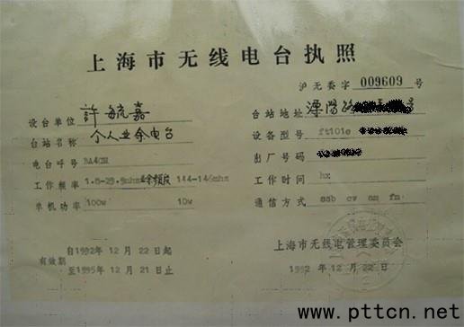 圖1 上海市業(yè)余電臺執(zhí)照 為了使個人業(yè)余電臺活動有一個良好的開端,并為逐步全面開放積累經(jīng)驗,當(dāng)時主管業(yè)余電臺的國家無委和負(fù)責(zé)業(yè)余電臺活動的國家體委共同研究商定,首先從北京、上海、廣州等地老一輩業(yè)余無線電愛好者這個群體開始試點。他們不僅在年輕時就具備有關(guān)業(yè)余電臺各方面的知識和豐富的操作經(jīng)驗,長期以來也一直表示再次設(shè)置業(yè)余電臺的強(qiáng)烈愿望,而且他們都有著較高的自律習(xí)慣和綜合素質(zhì)。于是有31位老業(yè)余家(北京18位,上海10位,廣州3位)提出申請,并經(jīng)體委審核,最后由無線電管理機(jī)構(gòu)發(fā)給電臺執(zhí)照,作為第一批試點。1992年12月22日上午,這其中一半以上的老業(yè)余家準(zhǔn)時在頻率上發(fā)訊。到1993年2月下旬的2個多月時間里,第一批試點的電臺基本上全部實現(xiàn)on air。