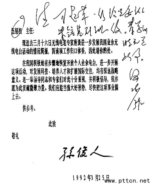 圖13 老部長親自簽名給伍紹祖的信 朱镕基副總理接到伍紹祖主任送去的老部長信和簡報后,很快就轉(zhuǎn)給了國家無委辦公室。隨后國家無委辦公室于1992年4月向國家無委提交了《關(guān)于進(jìn)一步開放業(yè)余無線電臺的請示》,并立即得到朱镕基副總理的批準(zhǔn)。根據(jù)批示精神,國家無委、國家體委共同研究制定了《個人業(yè)余無線電臺管理暫行辦法》,并于1992年9月23日發(fā)布施行。于是就有了本文開頭1992年12月22日一批老業(yè)余家on air的一幕。
