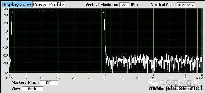 在儀表上觀察, X軸(橫軸)為時間,單位ms,Y軸(豎軸)為功率,單位dBm。下圖所示為真實測試時的截圖,左半部分為時隙1,右半部分為時隙2,可見只有一個時隙在工作。
