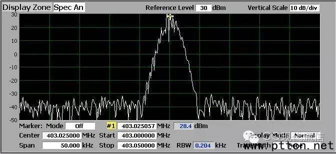 經(jīng)過連接設(shè)備、設(shè)置參數(shù)、掃頻尋找信號等步驟,從檢測儀表的頻譜分析界面可看到DMR的頻譜,如下圖所示?煽吹竭@是一個中心頻點為403.125MHz的信號,X軸(橫軸)為頻率,Y軸(豎軸)為功率,單位dBm。