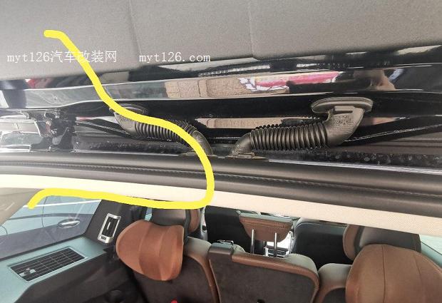 天線的走向大致就是這個樣子的。把頂棚上的護(hù)板拆開后,就可把天線一直往上穿,就能看到線頭,抻過來就可以。一直固定到尾門線束保護(hù)管那兒。