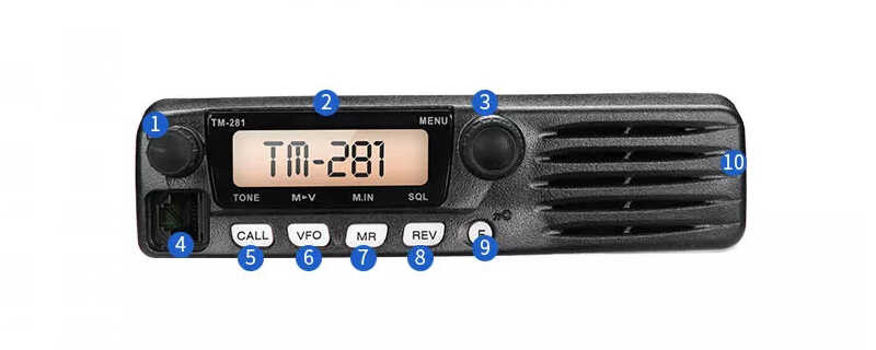 1.電源開關/音量旋鈕 2.液晶顯示屏 3.MENU按鈕/調頻控制旋鈕 4.話咪/數(shù)據(jù)接口 5.CALL按鍵 6.VFO按鍵 7.MR按鍵 8.REV按鍵 9.鍵盤鎖/第二功能按鍵