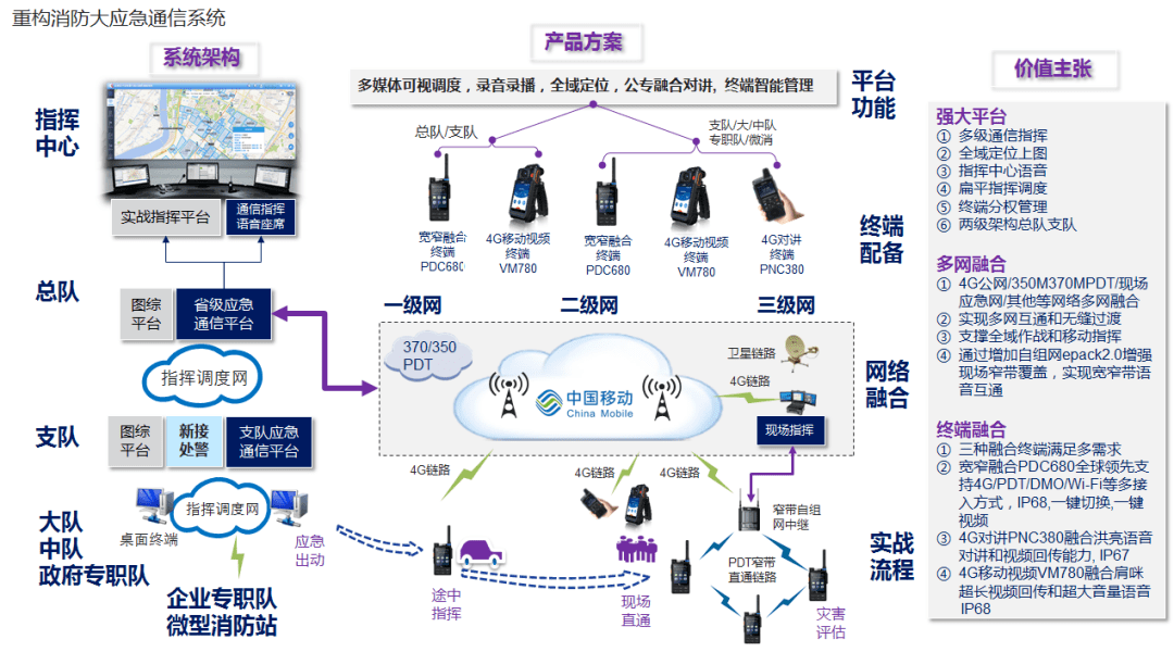 三 重構消防大應急通信網 作為國家綜合性消防救援隊伍,如何滿足“全災種, 大應急”新使命和新要求;如何實現消防信息化“提質強能”; 如何抓住適應新時代,優化重塑、轉型跨越的關鍵階段;如何堅持“兩手抓兩手硬”; 補齊短板提升應急通信能力,重塑消防應急通信迫在眉睫。 消防部門目前依賴的地面無線通信手段主要包括公網,窄帶PDT集群系統,現場直通/窄帶自組網,寬帶MESH/LTE等。規劃建設“370M一張基礎專網,多網融合一張無線網,寬窄融合一終端,應急通信融合一平臺,指揮調度一張圖”是實現全連接全感知彈性無線應急通信的關鍵任務。 廣東省消防救援總隊進行大量的探索與實踐,結合客觀現實條件, 摸索形成一套全面完整大應急通信網的網絡架構與規劃建設,“重構消防大應急通信網”(下圖) 與現有的系統兼容互補,通過構建大應急通信平臺,配備多形態移動終端,專網云與端側結合;實現“整合各類無線通信資源,統一應急指揮調度,公專網融合互通,前后方上下聯動,重心下沉面向救援 ”;助力消防智能指揮升級,支撐實現“精準化接警調度、全過程指揮和智能化輔助決策” ;構建下一代中國特色消防大應急融合無線通信網絡,分三步走實現指揮調度橫向到邊縱向到底的目標 。 (一)建設總隊應急通信平臺融合一級網二級網三級網:打通總隊,支隊與現場 實現多網互通、統一指揮、通信無縫跨區過渡,配備各類融合終端,新增寬窄融合終端,4G移動視頻終端,4G對講終端,并與現網窄帶終端兼容互通,實現統一呼叫、全域定位、錄音錄播、終端管理、可視調度、語音坐席等能力。 (二)建設支隊應急通信平臺,構建形成支隊與總隊2級架構,應急通信網與智能接處警系統有機融合,并通過配備的4G融合終端支持智能定位,可視上圖、扁平調度、移動指揮、處警app應用、智能報告、一鍵視頻、智能合成作戰、火場文書等能力提升支隊大中隊等作戰單元處警效能。 (三)通過無線手段將指揮調度延伸到社區、園區、企業微型消防站和專職隊,綜合性救援隊,聯動單位等,配備多種形式的消防救援作戰調度臺和4G對講終端,通過平臺+終端架構實現消防救援與社會輔助救援力量聯勤聯動體系的通信方案,確保社會力量等多種形式消防救援隊伍高效、可靠地納入統一指揮調度;實現救早、滅小和“三分鐘到場”的目標。