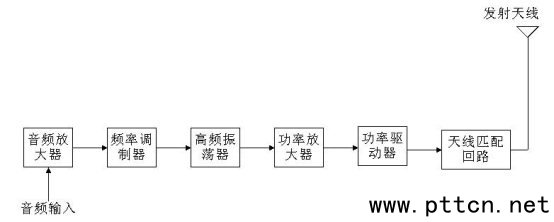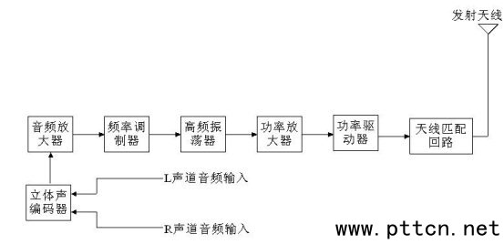 圖2 立體聲調頻收音機組成結構框圖 調頻無線廣播,采用調頻的調制方式,用音頻信號去控制高頻載波的瞬時頻率,使原為等幅恒頻的高頻載波信號的瞬時頻偏隨調制信號的幅度的變化而變化。一般規定調頻廣播的載波頻率范圍為87-108MHz。 音頻放大器,將話筒送來的信號進行放大,達到一定幅度后去控制頻率調制器,實現調頻。 頻率調制器中有可變電抗元件,其電容量隨著兩端所加電壓的變化而改變。用音頻信號去控制可變電抗元件兩端的電壓,使可變電抗元件的電抗值(一般是指電容)隨著音頻信號幅度的改變而做周期性變化,可變電抗元件同時又是高頻載波振蕩器諧振回路的一部分,當可變電抗元件的電容值發生變化后,高頻載波的瞬時頻率也會發生相應的變化,從而實現頻率調制。 高頻載波振蕩器產生的高頻載波幅度通常很小,需要經過高頻電壓放大和高頻功率放大后,才能推動天線,增加發射距離。 天線匹配回路使功率的輸出端和天線的輸入回路相匹配,使功放的輸出功率能夠最大限度的傳輸給天線,以提高效率。