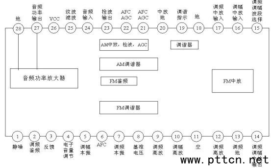 圖4立體聲調頻發射機組成結構框圖 KA22425D單片集成電路:工作電壓2-7.5V,Vcc=6V, KA22425D采用28腳雙列扁平封裝,管腳排立如下圖所示: