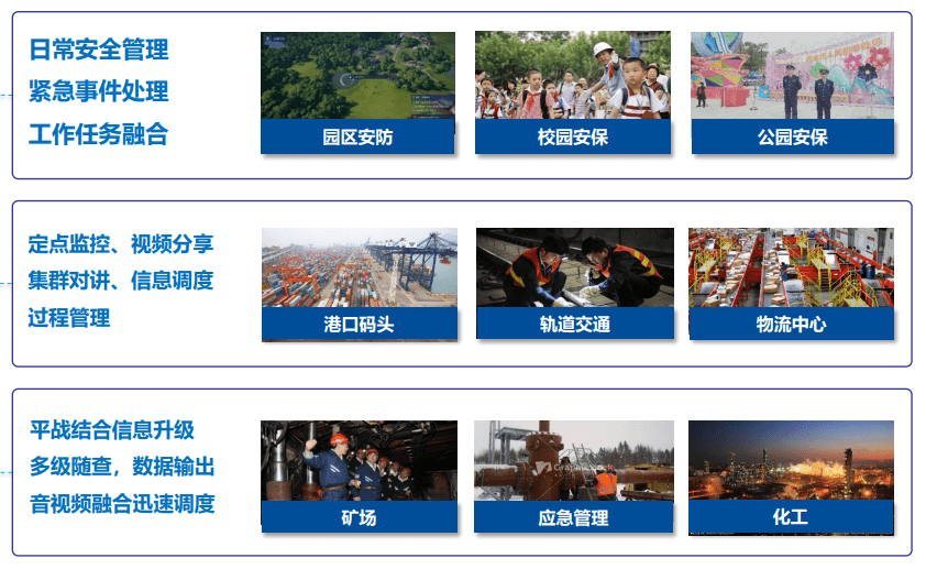 針對(duì)垂直行業(yè)提供靈活的行業(yè)定制方案 智慧監(jiān)獄 以矯正罪犯為行刑目的,以執(zhí)行刑法為職能的現(xiàn)代監(jiān)獄。監(jiān)獄工作內(nèi)容繁雜、責(zé)任重大,主要包括防止犯人越獄脫逃、打架斗毆、自傷自殘、騷亂、**、哄鬧監(jiān)獄等工作。全面推進(jìn)依法治監(jiān),全力確 保監(jiān)獄安全,全心服務(wù)社會(huì)發(fā)展,是每一位監(jiān)獄工作者的追求目標(biāo)。 中國(guó)移動(dòng)的融合調(diào)度解決方案,能夠滿足客戶(hù)需求,嚴(yán)格管控終端的保密性、娛樂(lè)性,卸載預(yù)制APP、禁止上網(wǎng)、短信、電話等功能;實(shí)現(xiàn)整個(gè)監(jiān)區(qū)的即時(shí)通訊和應(yīng)急通訊功能,并保障數(shù)據(jù)安全性。 軌道巡檢 鐵路安全生產(chǎn)解決方案是面向鐵路運(yùn)營(yíng)、養(yǎng)護(hù)等與鐵路安全生產(chǎn)相關(guān)的行業(yè),具備集群對(duì)講、實(shí)時(shí)視頻、電子地圖、工作流程監(jiān)控記錄及分析等能力,提供現(xiàn)場(chǎng)作業(yè)標(biāo)準(zhǔn)化流程監(jiān)控、日常巡檢自動(dòng)提醒及監(jiān)管、作業(yè)異常自動(dòng)告警、安全信息記錄分析等功能,解決用戶(hù)工作信息化程度不高,實(shí)時(shí)監(jiān)管手段不足、事后追溯追責(zé)不易等痛點(diǎn)的一體化解決方案。 中國(guó)移動(dòng)融合調(diào)度解決方案,針對(duì)鐵路作業(yè)實(shí)際情況,結(jié)合作業(yè)管理需要,引進(jìn)多款對(duì)講終端及智能終端,方便作業(yè)人員與管理人員使用。 應(yīng)急指揮 應(yīng)急指揮系統(tǒng)是以融合通信、空天地感知等技術(shù)為支撐,突出應(yīng)急信息全面匯聚、快速展現(xiàn)、上傳下達(dá)、協(xié)同會(huì)商、指揮調(diào)度等支撐能力,建立反應(yīng)靈敏、協(xié)同聯(lián)動(dòng)、科學(xué)決策的應(yīng)急指揮信息系統(tǒng),實(shí)現(xiàn)值班值守、突發(fā)事件接報(bào)、預(yù)案管理、指揮調(diào)度、救援資源管理等主要業(yè)務(wù)功能。 中國(guó)移動(dòng)融合調(diào)度解決方案,對(duì)全省涉及應(yīng)急管理的工礦商貿(mào)及危化品等企業(yè)的視頻監(jiān)控平臺(tái)進(jìn)行整合,搭建應(yīng)急管理視頻會(huì)商系統(tǒng)及結(jié)合GIS信息的指揮調(diào)度系統(tǒng)。