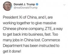 上周日的母親節(jié),遠在大洋彼岸的美國總統(tǒng)特朗普也沒閑著,發(fā)推表示“我和習主席正攜手合作,為中國的通信巨頭中興通訊提供一條快速重返經(jīng)營正軌的道路。(中興受制裁)使得太多的工作崗位在中國流失了。我已經(jīng)指示美國商務(wù)部盡快完成手續(xù)! 這條推特被諸多