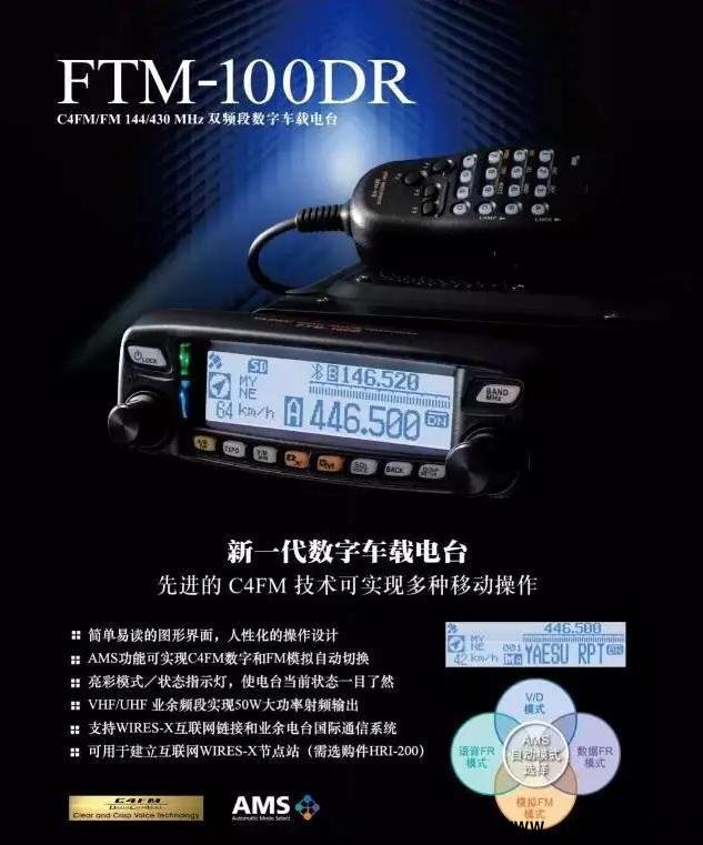 新產(chǎn)品介紹------ FTM-100DR C4FM/FM 144/430MHz 50W雙頻段數(shù)字對(duì)講機(jī) 八重洲系統(tǒng)融合功能的新款產(chǎn)品-FTM-100DR C4FM/FM 144/430MHz雙頻段數(shù)字車載對(duì)講機(jī)。 新產(chǎn)品FTM-100DR通過(guò)配備全點(diǎn)陣顯示屏設(shè)計(jì)實(shí)現(xiàn)了顯示大范圍系統(tǒng)融合功能和模擬功能的信號(hào)接收,F(xiàn)TM-