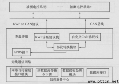 電動觀光車遠程實時監控系統包含兩路通信:一路是監控終端與整車通過CAN通道進行通信,采用高速500kbps速率,數據鏈路層協議符合Bosch2.OB標準,應用協議采用自定義CAN應用協議以及KWP2000協議來進行控制與數據通信;另一路是無線GPRS通信協議,理論速率為11