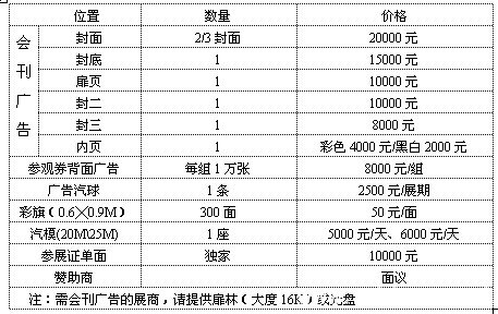 主頁(http://www.130131.com):2010第四屆杭州國際社會公共安全產(chǎn)業(yè)博覽會(2) 取消其參展資格,已交參展費(fèi)用概不退還,必要時(shí)交有關(guān)部門處理。 廣告內(nèi)容: ![]() 博覽會日程安排 2010年3月29日-30日 上午9:00-下午4:30 報(bào)到、布展 2010年3月31日-4月2日 上午9:00-下午4:30 展覽、交流與洽談; 2010年4月2日 下午3:00 撤展。 參展費(fèi)用: 1、一樓:9M2 (3M×3M) 人民幣6800元 2、如欲租用大于9M2展位,以3M2遞增;租用光地的企業(yè),以36M2起租。 3、9M2標(biāo)準(zhǔn)展位包括: 板墻(白色2.5M高)、洽談桌一張、椅子兩把、中文楣板、220伏/5A電源插座一只,射燈2支、紙簍一只。大會提供展品運(yùn)輸、會務(wù)、代訂機(jī)票服務(wù)、費(fèi)用由參展企業(yè)自理。 4、技術(shù)講座,產(chǎn)品推介場地費(fèi): 按一小時(shí)為一個(gè)計(jì)算單位,人民幣3000元/小時(shí),不足一小時(shí)按一小時(shí)計(jì)收。 參展商報(bào)名后七天內(nèi)支付所需費(fèi)用全款50%的定金,否則展位不予保留,余款請于2010 年3月10日前付清。 注: 參展商租用光地自行搭建展臺,自行承擔(dān)所有搭建費(fèi)和額外電費(fèi)及相關(guān)管理費(fèi)用。 匯款帳戶: 收款單位:杭州華展展覽有限公司 開 戶 行:杭州市工商銀行保俶支行 收款帳戶:1202022709006802266 組委會聯(lián)系地址: 杭州省府路9號浙江省人民大會堂3樓 杭州華展展覽有限公司 電話:0571-88080648、88069757、88069831、88806467 傳真:0571-88806467 E-mail:xjwork@tom.com 郵編:310007 聯(lián)系人:方 琴 13858084285 網(wǎng)址:www.hz-expo.com (中國集群通信網(wǎng) | 責(zé)任編輯:陳曉亮) |