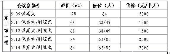 (二)特裝展位限高 1、序館、中央大廳限高5米; 2、東、西平臺限高4米; 3、東一館一、二層、西一館二層限高4米。 (三)標準展位楣板 楣板總高度為22厘米,字體為黑體,中文文字大小為12*12厘米,藍底白字。將根據(jù)貴公司填寫的《標準展位楣板內(nèi)容回執(zhí)》(附件1)內(nèi)容制作展位楣板。 五、技術(shù)交流 技術(shù)交流講座自5月13日下午至15日上午,共計4個半天。每半天每間會議室安排1場講座。會議室位置、編號及價格如下: