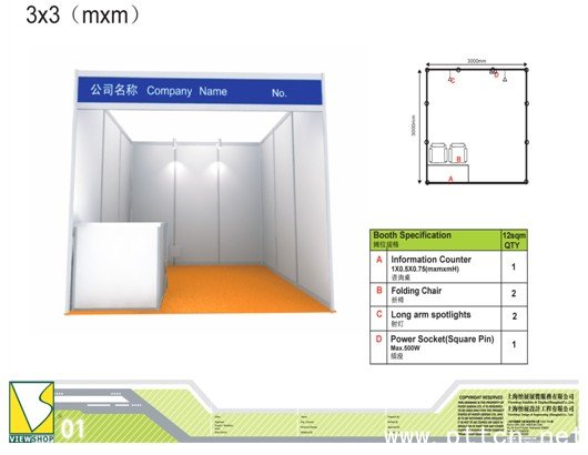 (一)展位 1、特裝展位。展位僅提供光地,不提供任何展具?捎蓞⒄箯S商自行搭建展臺,但展臺不得超過規(guī)定展位面積和限制高度。另外,搭建管理費、特裝電源費、布展證另行收費。 2、標準展位。每個展位配有三面展板、全鋪地毯、一張問詢桌、兩把折椅、 二盞射燈、一只500W電源插座、一塊公司名稱楣板。如有特殊要求需另行收費,詳細內(nèi)容請參見《第十屆上海社會公共安全產(chǎn)品國際博覽會參展手冊》第三部分《展會現(xiàn)場租賃價目表》。