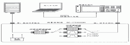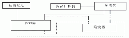 圖2 測試系統(tǒng)連接狀態(tài) 測試系統(tǒng)的主要功能包括:用戶管理、儀器在線狀態(tài)診斷、系統(tǒng)校準、測試規(guī)劃編制、斷點續(xù)測、數據記錄與管理、原始記錄和測試報告生成等主要模塊,最大限度地減少了人為參與和干預的因素,有助于提高測試效率,是一套準自動化測試系統(tǒng)。 3.4 測試系統(tǒng)的使用步驟和測試方法 基站的現(xiàn)場檢測工作,需要測試單位和受檢單位的緊密配合,必須預先商定測試計劃,明確測試地點和時間,測試單位還要事先向受檢單位說明檢測的步驟,提出配合檢測的必要條件和測試的方法,使受檢單位相關崗位人員事前通知,并知曉如何有效配合,保證測試順利進行。到達測試現(xiàn)場后,需要做以下工作: 首先要做的是準備工作。 一是應根據被測設備的安放方式、交流電源插座和測試端口位置,確定和部置測試儀器設備安放位置,滿足方便連接和便于操作的需要。此次的被測設備均為諾基亞BTS800i型基站,測試端口統(tǒng)一定位于載頻合路器射頻輸出口。二是開啟儀器和筆記本電腦處于正常工作狀態(tài),連接測試電纜、測試控制箱、陷波器,使測試回路處于準備調整的狀態(tài)。 其次,記錄被測設備信息和調整陷波器中心頻率。 一是啟動自動測試軟件,選擇被測設備類型,編輯測試任務規(guī)劃(可預先編輯),填寫基站信息(名稱、坐標、啟用時間)、測試設備信息(型號、序號)和報告基礎信息(報告編號、日期、檢測人員等)。 二是調整陷波器。這需要和運營商進行配合,先要由網管中心把基站信號關閉,斷開被測設備的正常發(fā)射回路,將測試控制箱連接到基站設備的射頻信號輸出端口上,并將控制箱置“衰減器”檔;然后由網管中心控制基站發(fā)出符合測試要求的信號,TETRA測試規(guī)定的信號為T1格式(單載頻、單時隙、滿功率)的信號,此次測試載頻全部設置為中間信道,載頻858.5125MHz,信道號為2340;之后設置頻譜儀使被測信號顯示正確,反復調整陷波器旋鈕使頻譜儀顯示信號幅度最小,并保持旋鈕位不動;再之后,更換連接電纜,如圖3所示(圖中點劃線部分為調整濾波器的連接,虛線部分為實測時的連接)。
