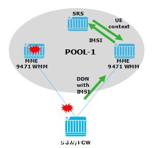有了備份服務(wù)器之后,當(dāng)一個(gè)MME宕機(jī)時(shí),終端用戶根據(jù)規(guī)范要求,到pool內(nèi)的其他MME上做附著操作,而MME則可以從備份服務(wù)器中(SRS)讀取用戶的動(dòng)態(tài)信息(UE context),只需要一次消息來(lái)回就可以代替很復(fù)雜的附著信令流程,從而大大降低了MME和HSS的瞬時(shí)信令壓力,提高網(wǎng)絡(luò)的總體安全性。如下圖所示。