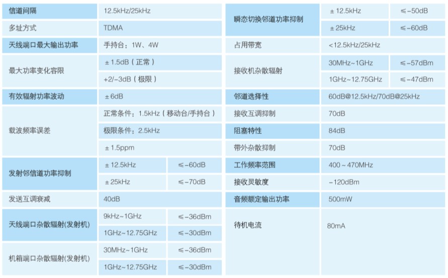 3、 特性 DMR數(shù)字對講 Ø 符合 ETSI TS 102 361(DMR) Tier I/II標(biāo)準(zhǔn)的協(xié)議 Ø 支持組呼、個呼、無地址呼、全呼、全雙工個呼等呼叫類型 Ø 支持非確認式短信、確認式短信、IP數(shù)據(jù)等業(yè)務(wù) Ø 支持連續(xù)話音、連續(xù)數(shù)據(jù)、雙時隙數(shù)據(jù)業(yè)務(wù) Ø 支持數(shù)話同傳 Ø 支持單頻中繼、雙頻中繼 Ø 支持端到端加密 Ø 具有遙暈/激活、遙斃等功能 Ø 具有PC接口,支持PC數(shù)傳功能 模擬對講 Ø 支持12.5kHz/25kHz模擬對講機應(yīng)用 Ø 支持加重、去加重、壓縮、解壓縮功能 Ø 支持靜噪設(shè)置 Ø 支持進行倒頻加密 Ø 具有掃描功能 4、 技術(shù)指標(biāo)