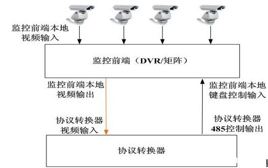 實(shí)現(xiàn)原理:監(jiān)控前端(DVR/矩陣)具有本地模擬輸出接口和本地鍵盤控制輸入接口,通過本地鍵盤,能夠?qū)Ρ镜啬M輸出接口的信號(hào)源進(jìn)行切換控制,指定連接在該監(jiān)控前端(DVR)上的某個(gè)攝像機(jī)視頻圖像通過本地模擬輸出接口輸出。同時(shí)協(xié)議轉(zhuǎn)換器具有485控制輸出接口,遠(yuǎn)程瀏覽終端能夠控制該485接口連接的設(shè)備。通過將協(xié)議轉(zhuǎn)換器485控制輸出接口和本地鍵盤控制輸入接口連接在一起,遠(yuǎn)程瀏覽終端能夠控制該監(jiān)控前端(DVR)本地模擬輸出接口輸出。同時(shí)將監(jiān)控前端(DVR)本地模擬輸出接口輸出與協(xié)議轉(zhuǎn)換器視頻輸入端口連接,就能夠在遠(yuǎn)程瀏覽終端切換瀏覽圖像的同時(shí),同步切換本地模擬輸出接口輸出,實(shí)現(xiàn)本地監(jiān)控視頻信號(hào)接入視頻生產(chǎn)視頻監(jiān)控調(diào)度系統(tǒng)。