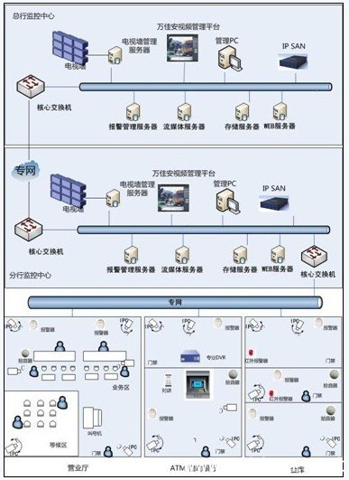 銀行視頻監(jiān)控系統(tǒng)監(jiān)視區(qū)域: ①營(yíng)業(yè)廳/網(wǎng)點(diǎn) ②自助行/ATM ③金庫(kù) ④辦公區(qū)域 前端的營(yíng)業(yè)廳/網(wǎng)點(diǎn)、自助行/ATM以及金庫(kù)將本地監(jiān)控視頻的圖像和報(bào)警信息上傳至分行監(jiān)控中心,并做本地存儲(chǔ);分行監(jiān)控中心統(tǒng)一對(duì)各監(jiān)控點(diǎn)的視頻信號(hào)、報(bào)警信號(hào)、對(duì)講請(qǐng)求信號(hào)、門(mén)禁控制等進(jìn)行統(tǒng)一規(guī)劃調(diào)度,按照權(quán)限設(shè)置對(duì)各個(gè)地區(qū)實(shí)行不同的管理,并對(duì)重要圖像資料和配置信息進(jìn)行集中存儲(chǔ);各級(jí)支行分控中心經(jīng)分行監(jiān)控中心分配權(quán)限后,從分行監(jiān)控中心的“流媒體”獲取實(shí)時(shí)流視頻,從前端設(shè)備獲取回放流視頻,在終端進(jìn)行顯示。對(duì)某些機(jī)密場(chǎng)所如金庫(kù)等的圖像進(jìn)行監(jiān)控限制,只有指定部門(mén)或人員才能查看。 三、系統(tǒng)設(shè)計(jì) 系統(tǒng)設(shè)計(jì)充分利用銀行系統(tǒng)網(wǎng)絡(luò)內(nèi)部組織機(jī)構(gòu)特點(diǎn),依據(jù)TCP/IP協(xié)議以及一些特殊的策略完成視頻信息、報(bào)警信息的傳遞、分發(fā)、存儲(chǔ)、檢索以及在中央管理中心的管理下對(duì)系統(tǒng)健康狀態(tài)檢查,保證系統(tǒng)安全、可靠、穩(wěn)定運(yùn)行。 設(shè)計(jì)要點(diǎn) 1.在營(yíng)業(yè)大廳、出納、儲(chǔ)蓄、金庫(kù)、出入口等要害部位安裝低照度、高清攝像機(jī),如130萬(wàn)高清紅外防暴半球網(wǎng)絡(luò)攝像機(jī)(WJA-CDN-4620E),在ATM柜員機(jī)上安裝隱蔽的針孔攝像機(jī)如WJA-PC-2030WD;對(duì)于銀行門(mén)口、車(chē)庫(kù)等大方位監(jiān)控區(qū)域,建議使用百萬(wàn)高清紅外球型網(wǎng)絡(luò)攝像機(jī)(WJA-CSN-5613IR)。 2.在各網(wǎng)點(diǎn)采用攝像機(jī)集中監(jiān)控平臺(tái)顯示方案,分別受權(quán)對(duì)各網(wǎng)點(diǎn)進(jìn)行顯示。分行控制中心可采用電視墻或數(shù)字拼接屏顯示各網(wǎng)點(diǎn)圖像,并將圖像上傳到總行。 3.系統(tǒng)實(shí)現(xiàn)對(duì)所有圖像的動(dòng)態(tài)感知,視頻報(bào)警抓拍查證,為智能型數(shù)字監(jiān)控系統(tǒng)。 4.采用大容量磁盤(pán)陣列存儲(chǔ)方案,全部實(shí)時(shí)錄像,保存數(shù)據(jù)時(shí)間可完全可以滿足銀行要求,推薦使用萬(wàn)佳安IPSAN系列網(wǎng)絡(luò)存儲(chǔ)設(shè)備。 5.在各網(wǎng)點(diǎn)和分行分控、總行控制中心均能方便的檢索回放錄像資料。 6.各網(wǎng)點(diǎn)和分行分控、總行控制中心均能方便的控制操作前端的云臺(tái)鏡頭,支持中文字符顯示及視頻丟失報(bào)警等功能。 7.每網(wǎng)點(diǎn)在金庫(kù)等要害部門(mén)靈活擴(kuò)充安裝紅外微波、腳挑開(kāi)關(guān)等報(bào)警探測(cè)器,由各網(wǎng)點(diǎn)使用控制。同時(shí)與分行或公安局報(bào)警中心聯(lián)網(wǎng)。 8.辦公區(qū)出入口安裝門(mén)禁系統(tǒng),采用指紋加IC卡的方式。 9.對(duì)于原來(lái)的模擬監(jiān)控錄像設(shè)備,增加網(wǎng)絡(luò)視頻服務(wù)器轉(zhuǎn)成數(shù)字信號(hào),連接到存儲(chǔ)服務(wù)器進(jìn)行錄像存儲(chǔ)。 10.在控制中心采用萬(wàn)佳安視頻監(jiān)控管理平臺(tái)ICMS9000。 萬(wàn)佳安銀行安防監(jiān)控系統(tǒng)平臺(tái)ICMS9000,采用模塊化設(shè)計(jì),部署方便,操作簡(jiǎn)單,系統(tǒng)能夠長(zhǎng)期高效穩(wěn)定運(yùn)行。也可根據(jù)銀行自身管理要求和監(jiān)控現(xiàn)狀做針對(duì)性的開(kāi)發(fā),充分體現(xiàn)監(jiān)控管理的效率。系統(tǒng)集數(shù)字圖像處理、圖像編解碼、分布式網(wǎng)絡(luò)、圖像傳輸、數(shù)據(jù)庫(kù)、信息管理等先進(jìn)的技術(shù)于一體,幫助用戶實(shí)現(xiàn)分行、支行、網(wǎng)點(diǎn)、自助銀行、金庫(kù)等業(yè)務(wù)機(jī)構(gòu)的統(tǒng)一監(jiān)控與綜合管理。 系統(tǒng)的典型拓?fù)浣Y(jié)構(gòu)圖: