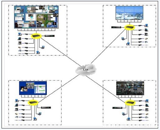 分布式控制系統(tǒng)的結(jié)構(gòu) 3、分布式控制系統(tǒng)的組成 我們可以看下上面那張拓?fù)鋱D上。用戶的電腦信號(hào)、復(fù)合視頻信號(hào)、高清視頻信號(hào)、音頻信號(hào)……是通過一個(gè)個(gè)處理器接入到交換機(jī)的,和顯示單元連接的是顯示處理器?刂齐娔X和服務(wù)器也需要接入到交換機(jī)。信號(hào)經(jīng)過處理器實(shí)際上是一個(gè)網(wǎng)絡(luò)編碼的過程,當(dāng)用戶有需求將某一路信號(hào)在大屏幕上制定位置顯示時(shí),顯示處理器負(fù)責(zé)解碼,而我們的服務(wù)器負(fù)責(zé)控制它的顯示方式。很顯然,控制部分和信號(hào)部分是獨(dú)立并行工作,各司其職,自然事半功倍。 4、分布式控制系統(tǒng)的優(yōu)勢(shì)應(yīng)用 1)數(shù)字化網(wǎng)絡(luò)傳輸 和傳統(tǒng)的控制系統(tǒng)相比,分布式系統(tǒng)的布線以網(wǎng)線為主,簡(jiǎn)單而且方便。傳統(tǒng)的RGB線纜、DVI線纜都有傳輸距離的限制超過了30米以后就會(huì)出現(xiàn)信號(hào)質(zhì)量下降,畫面抖動(dòng)、閃爍問題,需要增加其他外設(shè)補(bǔ)償信號(hào),從而降低了圖像的真實(shí)性,很難滿足用戶對(duì)信號(hào)質(zhì)量的高需求。特別是監(jiān)控系統(tǒng),遠(yuǎn)端信號(hào)傳輸已經(jīng)過一次轉(zhuǎn)換,如果再進(jìn)行數(shù)/模轉(zhuǎn)換,就會(huì)大大降低信號(hào)強(qiáng)度。這就給需要通過信號(hào)進(jìn)行調(diào)度指揮的用戶帶來諸多不便。 采用分布式只需要將信號(hào)源接入網(wǎng)絡(luò),在網(wǎng)絡(luò)帶寬滿足的情況下可以保證遠(yuǎn)距離傳輸,而且保證色彩還原度。 2)可擴(kuò)展性強(qiáng) 當(dāng)需要有其他的信號(hào)接入到控制系統(tǒng),我們只需要將這一路信號(hào)通過處理器接入到網(wǎng)絡(luò)就可以了。我們完全不必?fù)?dān)心會(huì)影響到其他信號(hào)的顯示,也不需要對(duì)系統(tǒng)進(jìn)行重新設(shè)定。這樣的操作可以完全在其他應(yīng)用正在進(jìn)行的時(shí)候進(jìn)行。 3)功耗低 每個(gè)處理器的功耗只有10w,更加環(huán)保和健康。 4)支持高分辨率信號(hào)顯示 分布式控制系統(tǒng)支持最大102400*7680的信號(hào)顯示,可以方便公安、交通部門的高分辨率GPS定位圖顯示到顯示墻上。 5)兼容網(wǎng)絡(luò)視頻流顯示 公安交通行業(yè)以視頻信號(hào)為主,近幾年網(wǎng)絡(luò)攝像頭技術(shù)越來越成熟并且被廣泛應(yīng)用。分布式控制系統(tǒng)也與時(shí)俱進(jìn)充分發(fā)揮其網(wǎng)絡(luò)化數(shù)字處理的技術(shù)優(yōu)勢(shì),目前,我們可以很自豪地說,市場(chǎng)上的大多數(shù)攝像頭都可以兼容我們的系統(tǒng)。 6)信號(hào)源共享支持多屏幕控制 加入交換機(jī)的信號(hào)可以被多個(gè)網(wǎng)內(nèi)的顯示墻共享。同時(shí)分布式系統(tǒng)支持一套系統(tǒng)控制多套顯示設(shè)備,其獨(dú)特的B/S架構(gòu)控制軟件更增加了操作者的使用便捷性。無須安裝客戶端軟件,只需要在瀏覽器上輸入服務(wù)器的IP就可以使用軟件。兼容windows,unix,ios等多個(gè)操作系統(tǒng)。