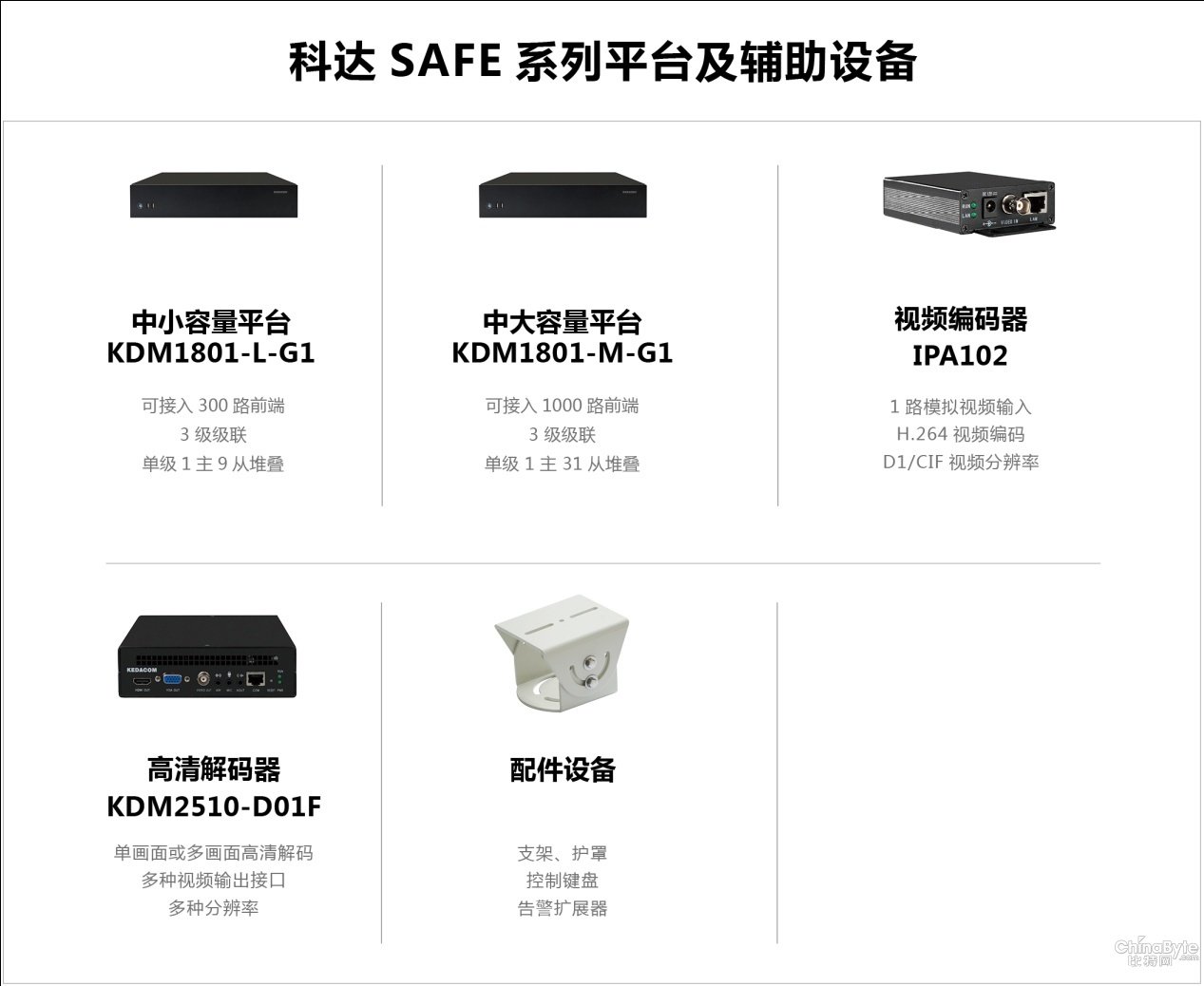 SAFE系列平臺(tái)及輔助設(shè)備 為滿足端到端的高清監(jiān)控部署需求,此次發(fā)布還同步推出了SAFE系列平臺(tái)、視頻編碼器以及高清解碼器等相關(guān)輔助設(shè)備: l SAFE系列平臺(tái),300路或1000路接入容量,多級(jí)級(jí)聯(lián)、多臺(tái)堆疊組網(wǎng) l SAFE系列視頻編碼器,1路模擬視頻接入、編碼 l SAFE系列高清解碼器,1路單畫面或多畫面高清視頻解碼輸出