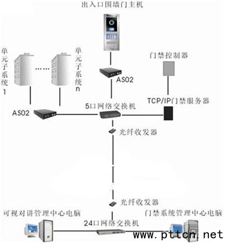 ![]() 以太網的可視對講系統(tǒng)示意圖 入戶線和主干線都是6芯線加視頻,聯網總線為4芯加視頻(在此案中也就是指從轉換器到可視對講服務器之間);從可視對講服務器至中心是4芯單模光纖。可視對講系統(tǒng)和門禁系統(tǒng)共用一個以太網絡——可視對講服務器和門禁服務器共用一個網絡交換機和光纖收發(fā)器,五類網線直接到管理中心總的網絡交換機。 系統(tǒng)特點: 小區(qū)大概是個長方形狀,而控制中心在整個小區(qū)的中央位置,所以以太網組網采用并聯的方式:多個單元用一個我可視對講服務器,它體積小(180MMX160MMX30MM)且自帶IP地址,標準的RJ45接口,每個可視對講服務器旁邊配置一個網絡交換機,門禁系統(tǒng)每個單元也是采用的傳統(tǒng)485加TCP/IP服務器的方式,對講和門禁的服務器出來的都是標準的TCP/IP信號和RJ45接口,不存在兼容性和以往對講和門禁相互干擾影響的問題,流量帶寬也足夠了。 結語: 采用數字信號傳輸,無信號衰減(無需信號放大),抗干擾能力強,應長距離傳輸,用五類線時達100米,光纖傳輸≥30KM,音頻、視頻控制共用網路,網絡布線簡單,線路可靠性強,可多條通道獨立傳輸,解決占線問題。 (中國集群通信網 | 責任編輯:陳曉亮) |