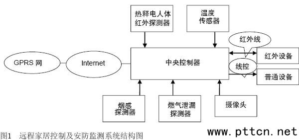 智能手機(jī)基本都具有GPRS功能。它采用開放式操作系統(tǒng),第三方可根據(jù)操作系統(tǒng)提供的API為智能手機(jī)開發(fā)各種擴(kuò)展應(yīng)用和提供各種擴(kuò)展硬件,利用智能手機(jī)這一特性再加上智能手機(jī)足夠的屏幕尺寸和強(qiáng)大的數(shù)據(jù)、聲音、圖像處理能力,可輕松開發(fā)出用于遠(yuǎn)程家電控制和安防監(jiān)測(cè)的應(yīng)用軟件,方便了用戶的操作。 基于智能手機(jī)的遠(yuǎn)程家電控制及安防監(jiān)測(cè)系統(tǒng)利用人們隨身攜帶的智能手機(jī)與中央控制器進(jìn)行會(huì)話,在中央控制器的控制下,通過相應(yīng)的硬件和執(zhí)行機(jī)構(gòu),實(shí)現(xiàn)對(duì)家電的遠(yuǎn)程控制和家庭內(nèi)部狀況的實(shí)時(shí)監(jiān)測(cè)。 系統(tǒng)總體結(jié)構(gòu)如圖1所示,主要由智能手機(jī)、中央控制器、熱釋電人體紅外探測(cè)器、溫度傳感器、煙感探測(cè)器、燃?xì)庑孤┨綔y(cè)器、攝像頭、家電設(shè)備、Internet和GPRS網(wǎng)絡(luò)組成。