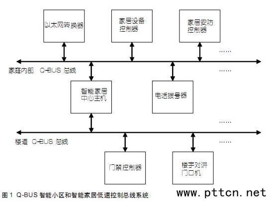 Q-BUS總線基于差分電壓傳輸方式利用CSMA/CD技術(shù)原理實(shí)現(xiàn)現(xiàn)場總線技術(shù),實(shí)現(xiàn)了數(shù)據(jù)可靠、高效的中長距離傳輸。 在家居內(nèi),往往只需要極少的數(shù)據(jù)就能滿足控制要求,直接用高帶寬實(shí)現(xiàn)的話,會(huì)造成資源的及大浪費(fèi),而對(duì)于語音和視頻數(shù)據(jù)配合專用網(wǎng)絡(luò)來實(shí)現(xiàn),這樣無論經(jīng)濟(jì)性,還是可靠性都是最合理的選擇。 家庭內(nèi)部Q-BUS總線連接了家庭內(nèi)部的智能、安防設(shè)備,完成家庭內(nèi)部獨(dú)立自主的智能生活,不受外界干擾;通過以太網(wǎng)轉(zhuǎn)換器,只要將家用服務(wù)器連接入Internet,就可以遠(yuǎn)程控制家居設(shè)備。外界數(shù)據(jù)通過家用服務(wù)器后,高流量數(shù)據(jù)通過家庭內(nèi)部的高速網(wǎng)傳輸,而低流量則通過Q-BUS總線的網(wǎng)絡(luò)平臺(tái)傳輸,實(shí)現(xiàn)的兩者的完美統(tǒng)一。 智能家居中心主機(jī)通過樓道內(nèi)Q-BUS總線連接至小區(qū)的智能化平臺(tái),構(gòu)成了家庭內(nèi)部與小區(qū)平臺(tái)數(shù)據(jù)交換的橋梁,不但可以實(shí)現(xiàn)最直接的數(shù)據(jù)溝通,而且實(shí)時(shí)性得到了保證。