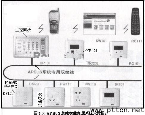 4.1系統(tǒng)特征 它是一個二線制的智能控制總線A US,所有的系統(tǒng)單元由一對通信信號線(雙絞線)連接成網(wǎng)絡(luò),亦是目前最簡單,最可靠,最易用的智能家庭控制總線標(biāo)準(zhǔn)之一。A US家庭智能控制系統(tǒng)是新一代智能家居系統(tǒng)。通過先進(jìn)的總線控制技術(shù)A US,實現(xiàn)對住宅燈光、電器及安防的無線遙控、電話及網(wǎng)絡(luò)的遠(yuǎn)程監(jiān)控等多種控制功能,融合了現(xiàn)代家庭追求舒適、安全、節(jié)能、高品味的家居生活理念。 該智能家居系統(tǒng)的家庭智能終端主要針對現(xiàn)代住宅家居智能化和保安智能化而設(shè)計的方案,可以實現(xiàn)如下功能:家庭綜合保安系統(tǒng);室內(nèi)照明控制系統(tǒng);家庭電器控制系統(tǒng);無線遙控系統(tǒng);遠(yuǎn)程控制系統(tǒng)。圖1為AP BUS總線智能家居系統(tǒng)示意圖。