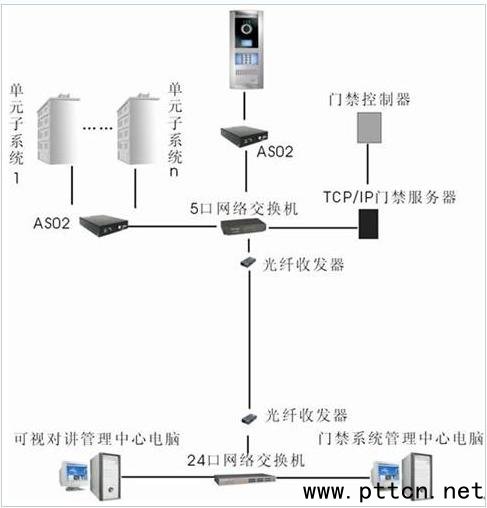 入戶線和主干線都是6芯線加視頻,聯(lián)網(wǎng)總線為4芯加視頻(在此案中也就是指從轉(zhuǎn)換器到可視對(duì)講服務(wù)器之間),從可視對(duì)講服務(wù)器至中心是4芯單模光纖。可視對(duì)講系統(tǒng)和門禁系統(tǒng)共用一個(gè)以太網(wǎng)絡(luò),可視對(duì)講服務(wù)器和門禁服務(wù)器共用一個(gè)網(wǎng)絡(luò)交換機(jī)和光纖收發(fā)器,五類網(wǎng)線直接到管理中心總的網(wǎng)絡(luò)交換機(jī)。