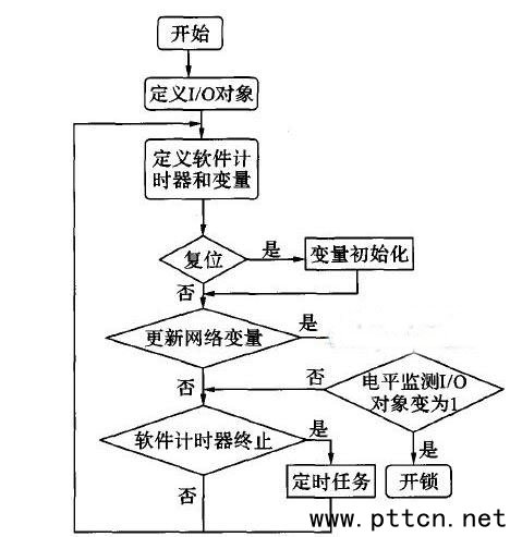 4 節(jié)點軟件設(shè)計 主程序流程如圖3所示。它主要完成的任務(wù)如下:首先對I/O對象和軟件計時器的定義以及設(shè)置變量初始值,判斷是否有“開鎖”信號,并啟動計時器開始計時,計時器終止時,Neuron芯片接受新的定時任務(wù) 。