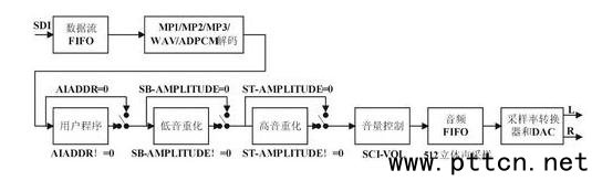 圖4 解碼芯片VS1011E控制流程圖 VS1011E通過(guò)一個(gè)工作于從模式的SPI串行總線與主機(jī)進(jìn)行數(shù)據(jù)和控制信息的交流,音頻數(shù)據(jù)通過(guò)串行數(shù)據(jù)接口(SDI)傳送,控制數(shù)據(jù)則通過(guò)串行控制接口(SCI)傳送。 VS1011E的SPI接口具有兩種工作模式:VS1002新模式(SM_SDINEW = 1)和VS1001兼容模式(SM_SDINEW = 0)。當(dāng)SM_SDISHARED = 0時(shí),控制信號(hào)和數(shù)據(jù)信號(hào)的傳送分別采用XCS和XDCS作為同步信號(hào);當(dāng)SM_SDISHARED = 1時(shí),共用XCS作為同步信號(hào)。 作為從機(jī)工作模式,VS1011E通過(guò)一個(gè)信號(hào)線Dreq指示是否允許主機(jī)傳送數(shù)據(jù),當(dāng)Dreq為高時(shí),VS1011E至少可以接受32KB的SDI數(shù)據(jù)或者SCI控制命令。 軟件控制要點(diǎn) (1)設(shè)置內(nèi)部控制寄存器MODE的參數(shù)。包括支持文件格式、軟啟動(dòng)設(shè)置、數(shù)據(jù)流模式設(shè)置、DCLK觸發(fā)沿設(shè)置和SDI數(shù)據(jù)首位設(shè)置等。SM_SDINEW和SM_SDISHARED設(shè)置也在這里進(jìn)行。 (2)如果時(shí)鐘速率不是24.576MHz,需要設(shè)置SCI_CLOCKF寄存器。若通過(guò)改變SCI_CLOCKF使用倍頻時(shí)鐘,應(yīng)該將適當(dāng)?shù)牟蓸铀俾蕦懭隨CI_AUDATA寄存器,等待至少11000個(gè)時(shí)鐘后才可以進(jìn)行SPI通信。 (3)設(shè)置音量寄存器SCI_VOL;0位為最大音量,0xFEFE位為靜音,0xFFFF將觸發(fā)模擬調(diào)電模式。 (4)若希望強(qiáng)化低音和高音,可以設(shè)置寄存器SCI_BASS。 (5)若使用用戶代碼,通過(guò)將SCI_AIADDR置零關(guān)閉它。