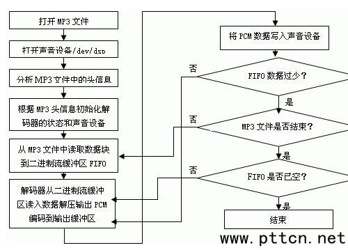 (4)ippsHuffmanDecode_MP3_1u32s/*哈夫曼解碼,輸出解碼后的數(shù)據(jù)*/ (5)ippsReQuantize_MP3_32s_I/*量化哈夫曼解碼后的碼字,輸出量化后的采樣值的指針*/ (6)ippsMDCTInv_MP3_32s,ippsSynthPQMF_MP3_32s16s/*第一、二階段合成濾波*/ 5.2 MP3音頻解碼流程 為了MP3文件能夠連續(xù)的播放,需要為原始二進制在內(nèi)存中建立一個FIFO緩沖區(qū),以保證每個時刻都有足夠的數(shù)據(jù),這個緩沖區(qū)要有足夠的大小,當緩沖區(qū)數(shù)據(jù)小于某個值時,就要及時寫入新的數(shù)據(jù),在程序的主循環(huán)中需要有段判FIFO數(shù)據(jù)情況和填入數(shù)據(jù)的程序。主數(shù)據(jù)也需要一個緩沖區(qū),用來存放解碼時用到的數(shù)據(jù),播放MP3文件的大致流程如下: