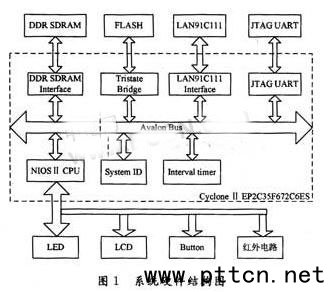 在本系統(tǒng)設(shè)計(jì)中,主要使用了如下的Altera IP,并對(duì)其進(jìn)行相應(yīng)設(shè)置: (2)FLASH Memory(CFI):該IP是外部存儲(chǔ)器FLASH控制接口模塊,完成對(duì)FLASH的時(shí)序控制; (3)DDR SDRAM Controller:該IP是外部存儲(chǔ)器DDR SDRAM的接口控制模塊,完成對(duì)DDR SDRAM的時(shí)序控制; (4)JTAG UART:該IP完成在主機(jī)PC和SoPCBuilder系統(tǒng)之間的字符流傳輸,進(jìn)行程序的下載,以及硬件軟件的在線調(diào)試; (5)LAN91C111 Interface:該IP是外部以太網(wǎng)芯片接口模塊,完成NIOSⅡ系統(tǒng)對(duì)外部LAN91C111網(wǎng)卡芯片的控制,進(jìn)而實(shí)現(xiàn)系統(tǒng)的以太網(wǎng)數(shù)據(jù)傳輸; (6)Character LCD:該IP是外部LCD的接口控制模塊,完成對(duì)外部液晶模塊顯示的控制; (7)PIO:該IP是通用I/O控制模塊,用來(lái)控制外部的輸入輸出; (8)Interval timer:該IP是系統(tǒng)的定時(shí)器模塊,完成對(duì)系統(tǒng)時(shí)間的處理。 在選定系統(tǒng)需要的IP資源后,就可以通過(guò)SoPCBuilder很快地在FPGA上構(gòu)建一個(gè)嵌入式系統(tǒng)。首先,定制軟核處理器,設(shè)定為standard標(biāo)準(zhǔn)型NIOSⅡCPU,4 kB指令緩沖器,支持JTAG下載調(diào)試;16 M FLASH用來(lái)存放用戶數(shù)據(jù)和程序;16 M DDR SDRAM用來(lái)作為系統(tǒng)運(yùn)行時(shí)程序的存儲(chǔ)空間;定制Avalon三態(tài)總線架構(gòu),將LAN91C111設(shè)置為Avalon總線的從器件,通過(guò)Avalon總線與NIOSⅡ系統(tǒng)相連,并定制LAN91C111的驅(qū)動(dòng)模塊,實(shí)現(xiàn)系統(tǒng)對(duì)于該芯片的控制。 搭建完系統(tǒng)的模塊后,需要為各個(gè)模塊設(shè)定中斷號(hào),讓CPU在運(yùn)行過(guò)程中判斷內(nèi)部和外部各種中斷的優(yōu)先級(jí),其中系統(tǒng)定時(shí)器的中斷優(yōu)先級(jí)最高,然后各個(gè)模塊的中斷優(yōu)先級(jí)從高到低依次為JTAG模塊、外部按鈕輸入、EPCS配置芯片、LAN91C111芯片。同時(shí)需要將FLASH存儲(chǔ)器的基地址設(shè)為0x000000,以便使系統(tǒng)每次都能從FLASH中開(kāi)始執(zhí)行指令。這樣,在使用SoPC Builder中的組件編輯器將用戶外設(shè)和系統(tǒng)連接起來(lái)后,就可以運(yùn)行SoPC Builder生成系統(tǒng)的硬件描述語(yǔ)言文件,編寫(xiě)相關(guān)的Verilog HDL模塊,將系統(tǒng)模塊和外部器件連接,然后通過(guò)QuartusⅡ軟件編譯整個(gè)FPGA設(shè)計(jì)項(xiàng)目。