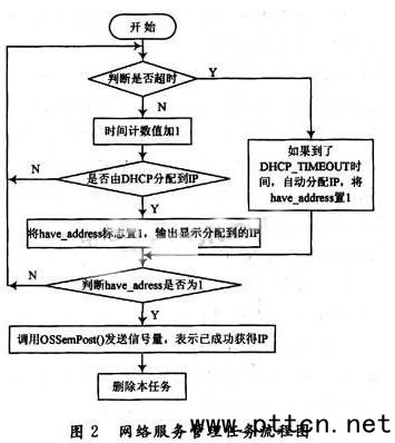 (2)網(wǎng)絡(luò)DHCP服務(wù)管理任務(wù):主要用來檢查DHCP服務(wù)是否成功,即系統(tǒng)是否成功分配到IP。該任務(wù)在完成后也自動(dòng)刪除。任務(wù)流程圖如圖2所示: