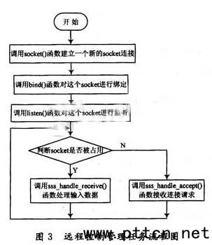 (3)遠(yuǎn)程控制管理任務(wù):主要用來在服務(wù)器和客戶端之間建立Socket連接,在服務(wù)器端接收從客戶端發(fā)送來的控制命令,并判斷這些命令來進(jìn)行相應(yīng)操作。任務(wù)流程圖如圖3所示:
