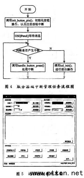(4)服務(wù)器端中斷管理任務(wù):主要在服務(wù)器端處理用戶產(chǎn)生的各種中斷,然后向客戶端發(fā)送相應(yīng)命令執(zhí)行對(duì)應(yīng)操作。任務(wù)流程圖如圖4所示。