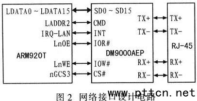 RJ-45采用HanRun公司的可對信號濾波的HR911105A接口,這樣可節(jié)約印刷板,并有效地減小電磁干擾。ARM920T與網(wǎng)卡DM9000AEP接口設(shè)計(jì)如圖2所示。圖中16根數(shù)據(jù)線相連;命令選擇引腳CMD,為高電平時,選擇數(shù)據(jù)端口,CMD為低電平時,選擇地址通道;IOR#為讀信號引腳;IOW#為寫信號引腳;CS#片選信號與ARM920T的片選信號線nGCS3相連。
