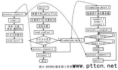 HTTPD服務(wù)器的工作流程如圖5所示。系統(tǒng)采用HTTPD多線程并發(fā)服務(wù)器結(jié)構(gòu)的設(shè)計(jì)思想,其工作特點(diǎn)是為每個客戶機(jī)請求分配一個線程,即服務(wù)器在同時處理多人請求。由每個線程處理客戶機(jī)的請求。在請求處理完畢后,子線程退出。服務(wù)器接收子線程的退出信號為其他的客戶機(jī)請求分配資源。