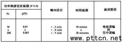 振動(dòng)試驗(yàn)條件有包含設(shè)計(jì)階段的正弦波(Sine Wave)測(cè)試,或隨機(jī)波(Random Wave)測(cè)試,它以不同的測(cè)試頻率、時(shí)間設(shè)定、依其類別做各軸向振動(dòng)試驗(yàn),如表二。