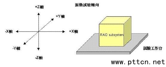 振動(dòng)測(cè)試 為了確?蛻羰盏酱疟P陣列系統(tǒng)后能夠順利進(jìn)行安裝、測(cè)試及上線運(yùn)轉(zhuǎn)使用,產(chǎn)品出貨運(yùn)輸途中或上線運(yùn)轉(zhuǎn)后,振動(dòng)環(huán)境測(cè)試與驗(yàn)證是磁盤陣列系統(tǒng)可靠度重要的一環(huán)。 磁盤陣列系統(tǒng),經(jīng)過實(shí)驗(yàn)室做程序化連續(xù)振動(dòng)仿真,以驗(yàn)證系統(tǒng)在工作周期,或包裝后運(yùn)送周期是否正常,原廠商需采用知名驗(yàn)證機(jī)構(gòu),將測(cè)試結(jié)果導(dǎo)入設(shè)計(jì),才能確保磁盤陣列系統(tǒng)設(shè)計(jì)與功\能達(dá)到標(biāo)準(zhǔn)。驗(yàn)證程序的設(shè)定,需依據(jù)業(yè)界規(guī)定項(xiàng)目并以實(shí)際制品為準(zhǔn),針對(duì)試驗(yàn)加速度,試驗(yàn)軸向如圖二、試驗(yàn)時(shí)間、試驗(yàn)嚴(yán)厲度等等相關(guān)條件進(jìn)行審查測(cè)試。