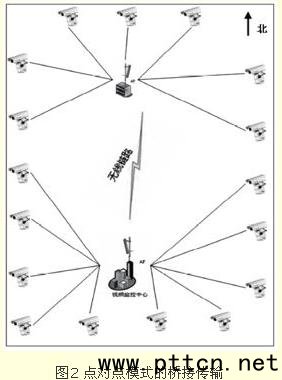 (2)點(diǎn)對(duì)多點(diǎn)型 點(diǎn)對(duì)多點(diǎn)型常用于有一個(gè)中心點(diǎn)、多個(gè)遠(yuǎn)端點(diǎn)的情況。其最大優(yōu)點(diǎn)是組網(wǎng)成本低、維護(hù)簡單,其次由于中心使用了全向天線,設(shè)備調(diào)試相對(duì)容易。該網(wǎng)絡(luò)的缺點(diǎn)也是因?yàn)槭褂昧巳蛱炀,波束的全向擴(kuò)散使得功率大大衰減,網(wǎng)絡(luò)傳輸速率低,對(duì)于較遠(yuǎn)距離的遠(yuǎn)端點(diǎn),網(wǎng)絡(luò)的可靠性不能得到保證。 (3)混合型 這種類型適用于所建網(wǎng)絡(luò)中有遠(yuǎn)距離的點(diǎn)、近距離的點(diǎn),還有建筑物或山脈阻擋的點(diǎn)。在組建這種網(wǎng)絡(luò)時(shí),綜合使用上述幾種類型的網(wǎng)絡(luò)方式,對(duì)于遠(yuǎn)距離的點(diǎn)使用點(diǎn)對(duì)點(diǎn)方式,近距離的多個(gè)點(diǎn)采用點(diǎn)對(duì)多點(diǎn)方式,有阻擋的點(diǎn)采用中繼方式。 4. 工程實(shí)例 “無線網(wǎng)絡(luò)視頻監(jiān)控系統(tǒng)”項(xiàng)目在統(tǒng)一規(guī)劃、統(tǒng)一管理的基礎(chǔ)上,采用固定地點(diǎn)攝像的方式,使用多種視頻采集端設(shè)備(網(wǎng)絡(luò)槍式攝像機(jī)、數(shù)字網(wǎng)絡(luò)球式攝像機(jī)、網(wǎng)絡(luò)視頻服務(wù)器、紅外夜視攝像機(jī)等),在交通環(huán)境、山地環(huán)境和高樓環(huán)境等不同地理位置、不同角度,對(duì)社區(qū)各區(qū)域的重要場(chǎng)景和主要部分進(jìn)行高質(zhì)量圖像拍攝,并將所拍攝的圖像通過無線電波的傳輸方式傳輸?shù)奖O(jiān)控中心。 例如,監(jiān)控范圍為一個(gè)長800米、寬600米的小區(qū),小區(qū)監(jiān)控中心位置在正南位置,正北位置的小區(qū)會(huì)所匯集南邊的視頻圖像,經(jīng)匯集中心AP向監(jiān)控中心傳送。 本案例采用點(diǎn)對(duì)點(diǎn)模式進(jìn)行橋接傳輸,如圖2所示。